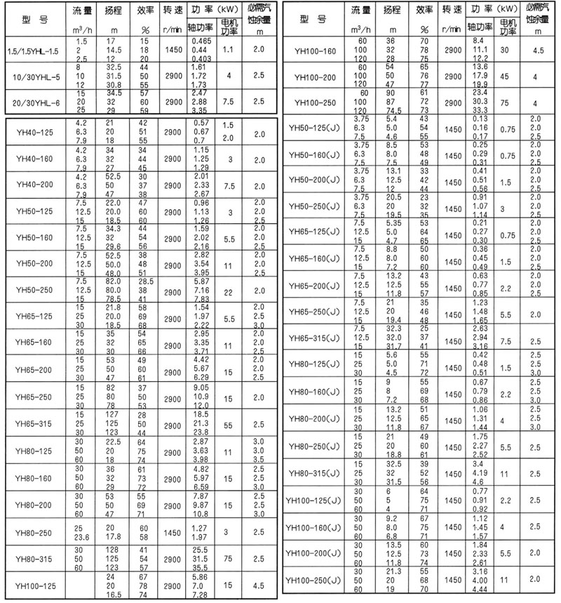 YH和YHL系列泵是單級、單吸、液下式離心泵(1.5/1.5YHLI.5是旋渦泵),流量范圍1.5~120m/h;揚程范圍2.5~127m。用于汲送井罐中不含固體顆粒、無腐蝕性的介質(如發(fā)煙硫酸)。介質最高溫度80℃。
