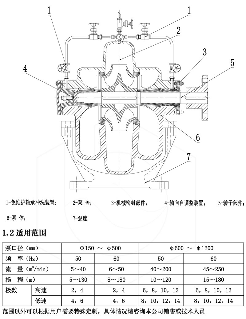ES 型雙吸泵的軸承為位于泵體內(nèi)部的自潤滑軸承來支撐轉(zhuǎn)子部件,其較大優(yōu)點(diǎn)是免維護(hù)(即無需日常維護(hù)保養(yǎng)),并具有安裝空間小、運(yùn)行平穩(wěn)、效率高,運(yùn)行及檢修費(fèi)用更低。